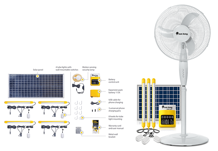 The pay-as-you-go Sun King Home 500X is a complete solar-powered entertainment and home lighting system. The package has everything needed to light and power a home for family entertainment. Affordable and expandable, the Home 500X is the ultimate home power solution.